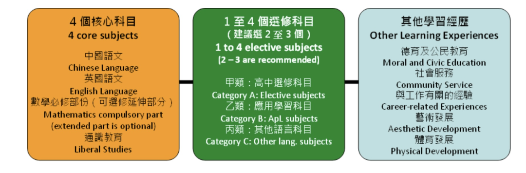 DSE考试是4+2模式:4门必修是中文、英文、数学、公民与社会发展,2-3门学生自己最擅长的选修课程,解救偏科选手。最低的科目分数还不计入最后成绩,大学录取以最佳的5门或6门计算成绩。DSE课程70%左右的知识点和内地普高课程相吻合,整体考试难度相当于高中会考。